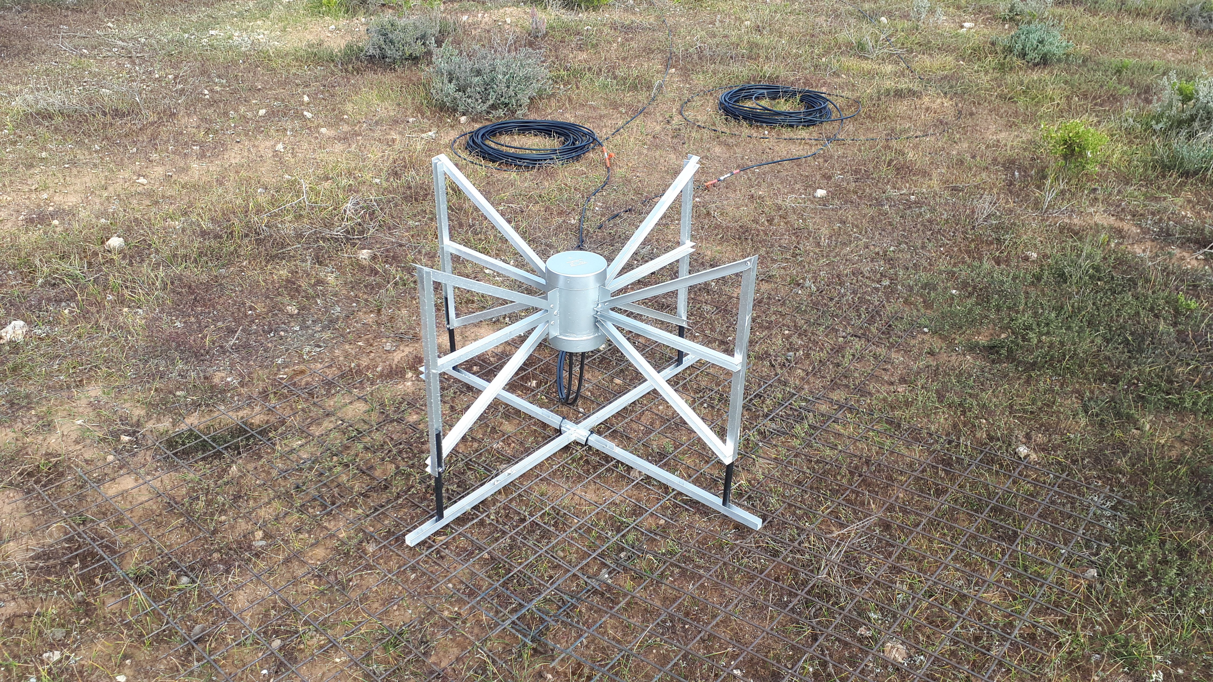 The 'triangular' antenna at the front of the image is our new low frequency crossed polarized 'active' antenna covering the HF band from 5 MHz to about 100 MHz and in the background is our Sun tracking log periodic antenna (LPA) with a working frequency range from 100 MHz to 850 MHz in the VHF / UHF band.
