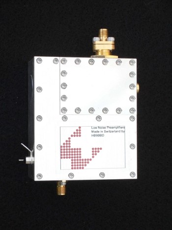 Radio power signals arriving from directions close to the axis of the parabolic antenna are focused by reflection to an antenna feedhorn optimised for operation at 1420MHz. Antenna gain is assumed to be approx. +30dBi. Signals then pass through two L band probes phased 90 degrees apart and coupled to a pair of low noise amplifiers (LNA) with noise figures of ≤ 0.2dB at 1420MHz. The LNAs were built, adjusted and tested as a matched pair by Dominique Faessler, HB9BBD - hb9bbd.ch. Each LNA provides an input 40MHz bandpass filter and two amplification stages producing 40dB of gain. The bandpass filters prevent out of band signals such as those generated by geostationary satellites and other man made interference sources from producing intermodulation products in the SDR's image rejection mixers.