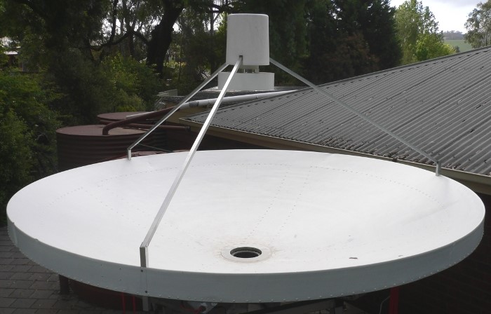 The antenna is a 3.05 metre diameter parabolic reflector with a focal length of 1.172 metres. A cylindrical feedhorn is mounted above the reflector in prime focus configuration. The reflector was manufactured by Siemens for Telecom Australia (Telstra Corp.) and has spent much of it's life as a communications link at the top of Mt.Macedon in rural Victoria. All modifications and conversion to the present configuration have been carried out by myself and my brother inlaw, Tony Davies.