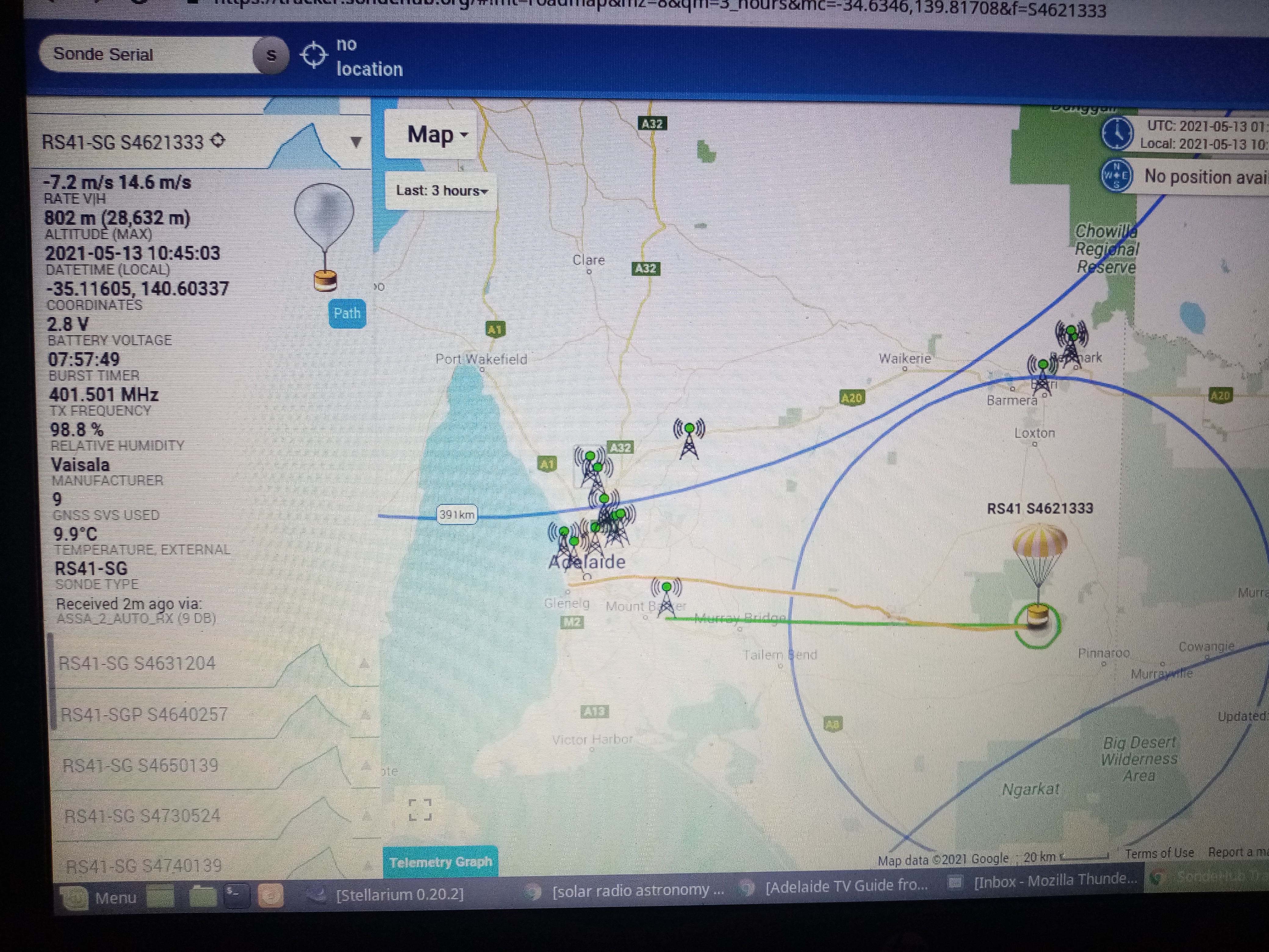 Currently (2021), BOM are launching balloons fitted with Vaisala RS41-SG sondes from Adelaide Airport and decoding these is somewhat problematic. This sonde’s signal turns on and off about every 0.5 seconds and is a digital transmission. COAA’s SondeMonitor software https://www.coaa.co.uk/sondemonitor.htm ‘should’ be able to decode these but I’ve not had any success with using that software to decode Vaisala RS41-SG digital transmissions.