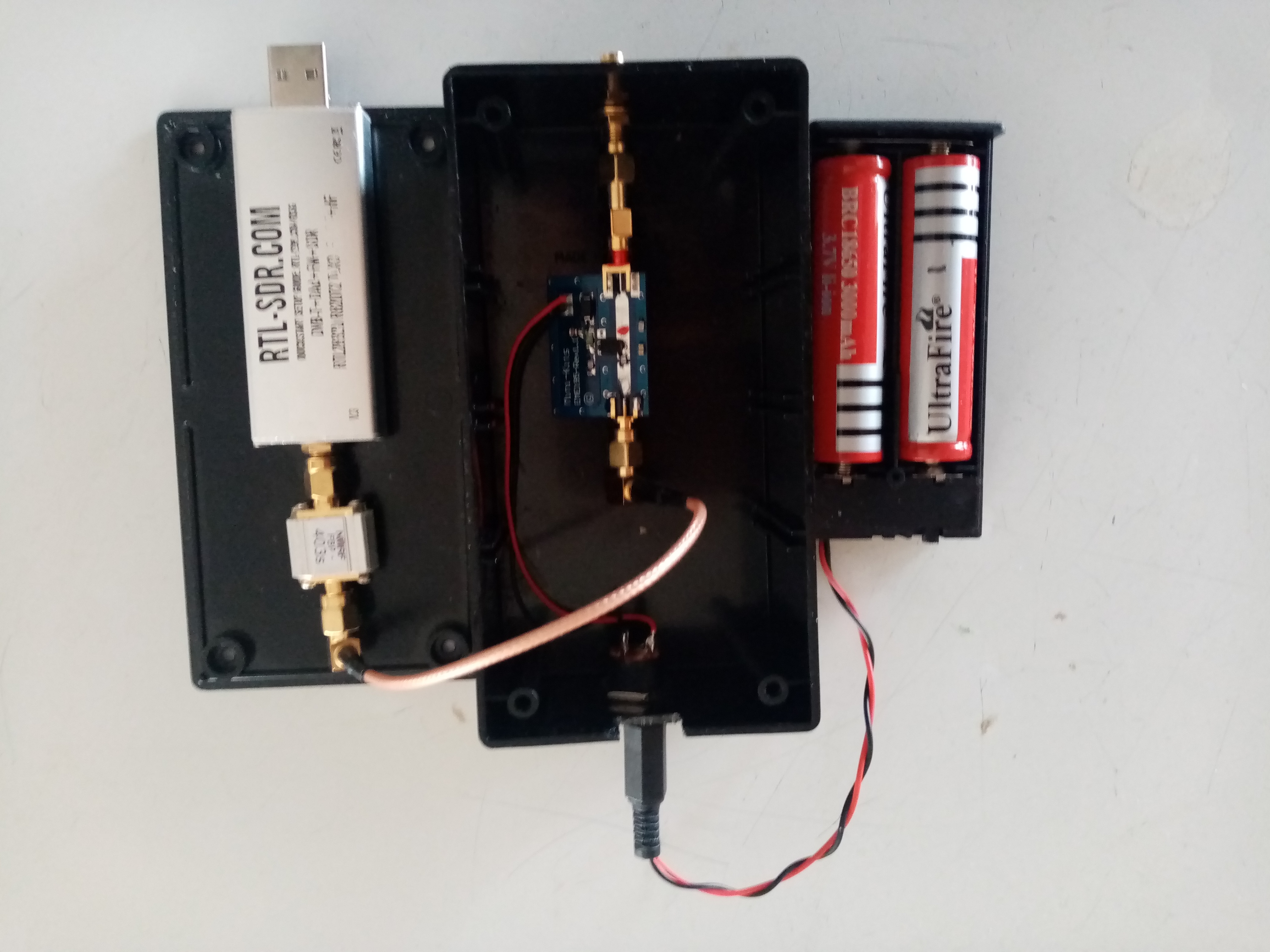 The LNA on top of the pole is powered via the coax cable from a DC source from two 18650 Li-ion batteries which provide about 7.4 Volts. This is located alongside the receiver and computer in the house.