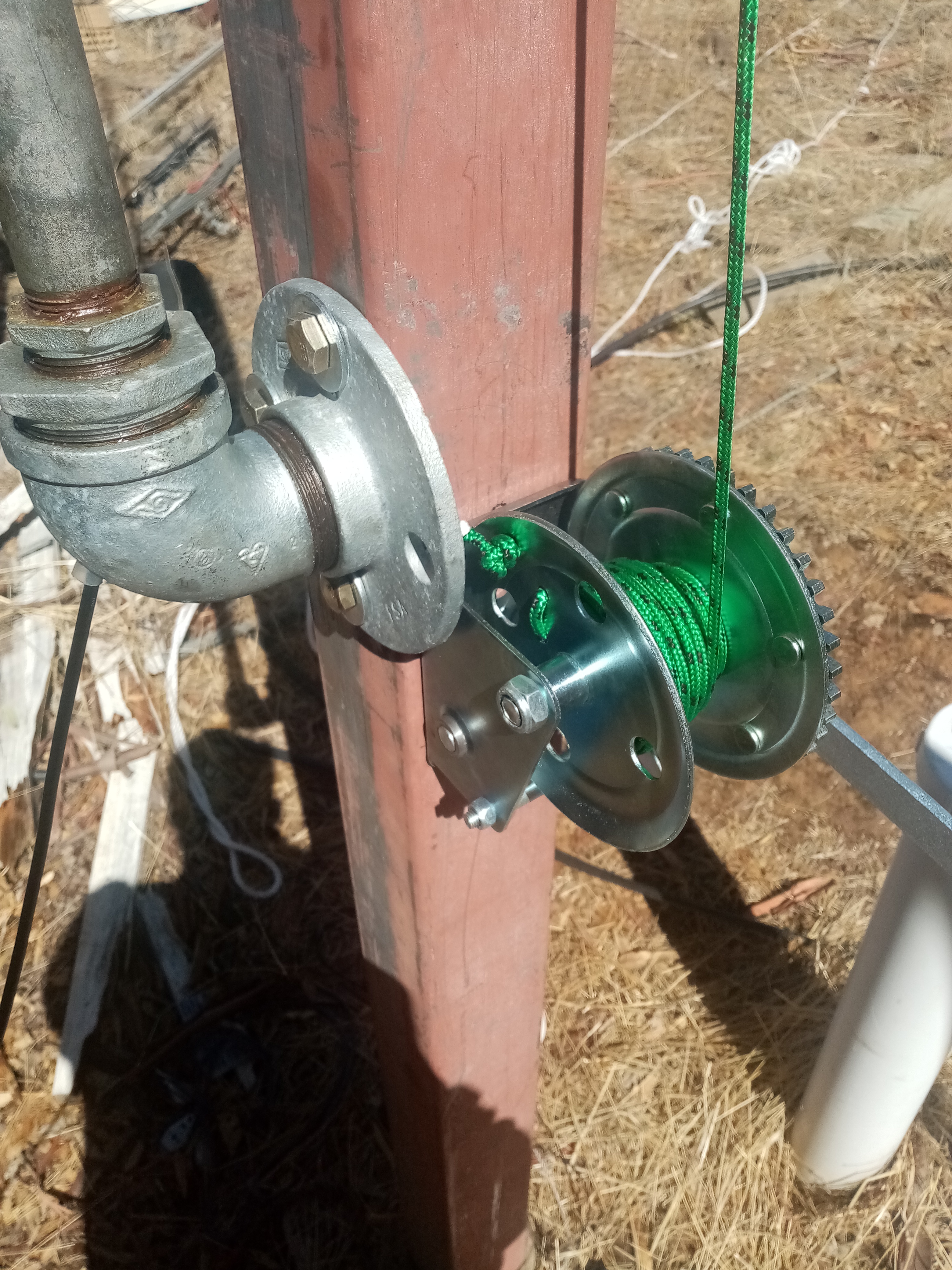 Mast winch and rotating 'bearing' fashioned from well greased pipe fittings. This allows the mast to be easily lowered for changes and maintenance.
