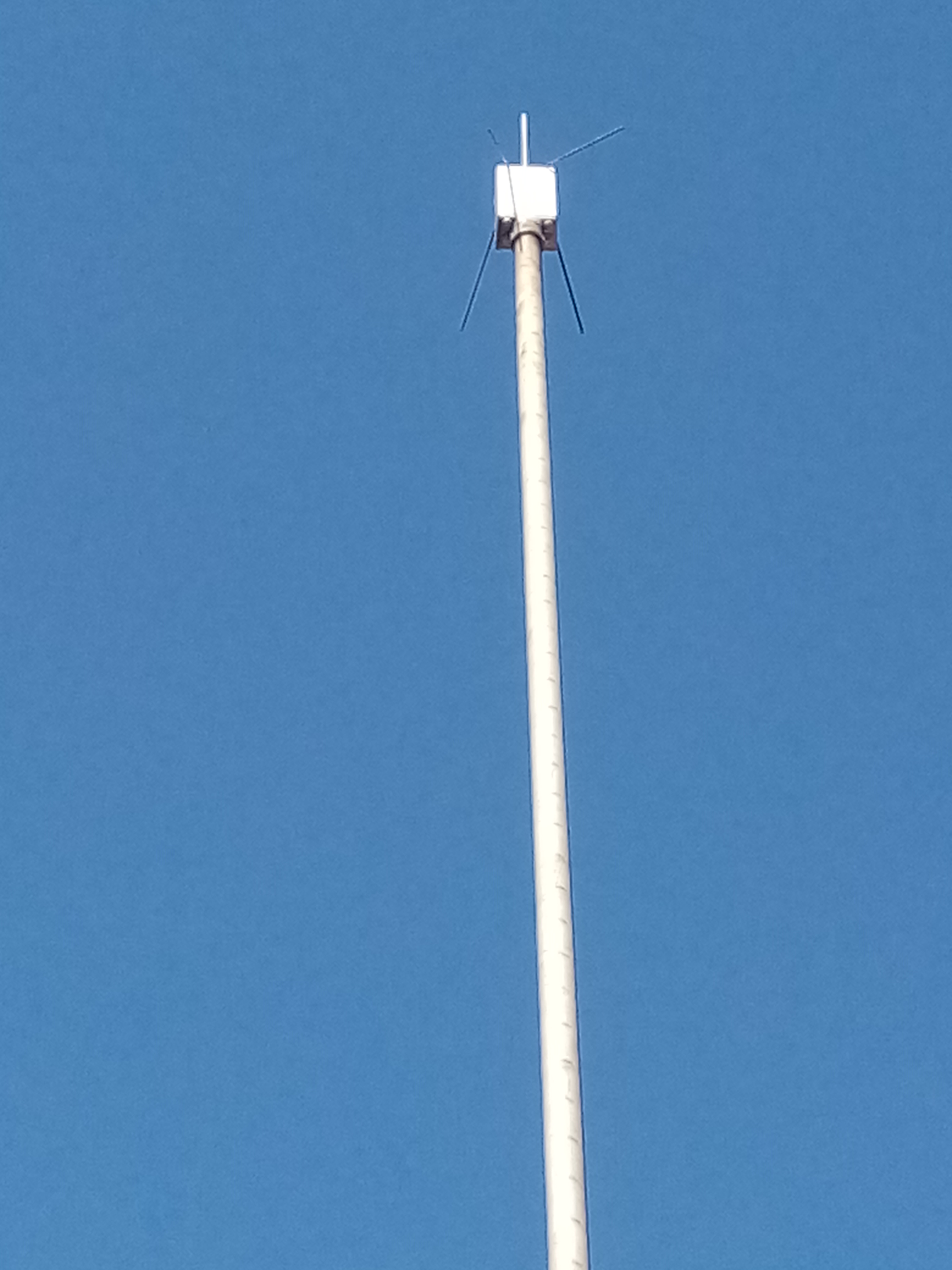 Closeup of the pole mounted box containing the LNA, an T Bias and the rods that form the ground plane.