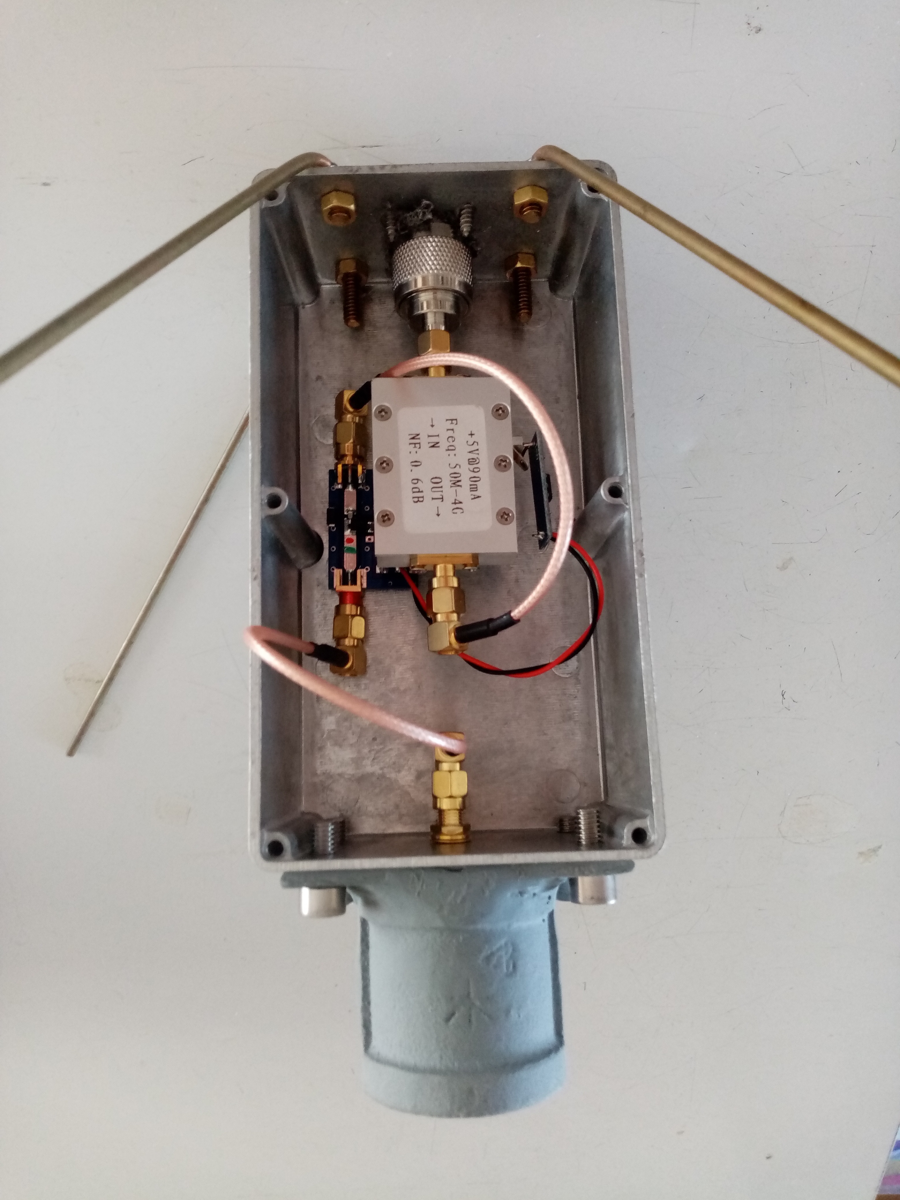 The box on the top of the pole, as well as the antenna, contains a low noise amplifier (LNA) with 20dB gain, a ‘reverse’ EME-195 Tbias card and a small 5-volt regulator module close to the amplifier. The box is sealed to prevent moisture entry as much as possible and also contains some small packets of desiccant to ‘soak up’ any residual moisture in the box.
